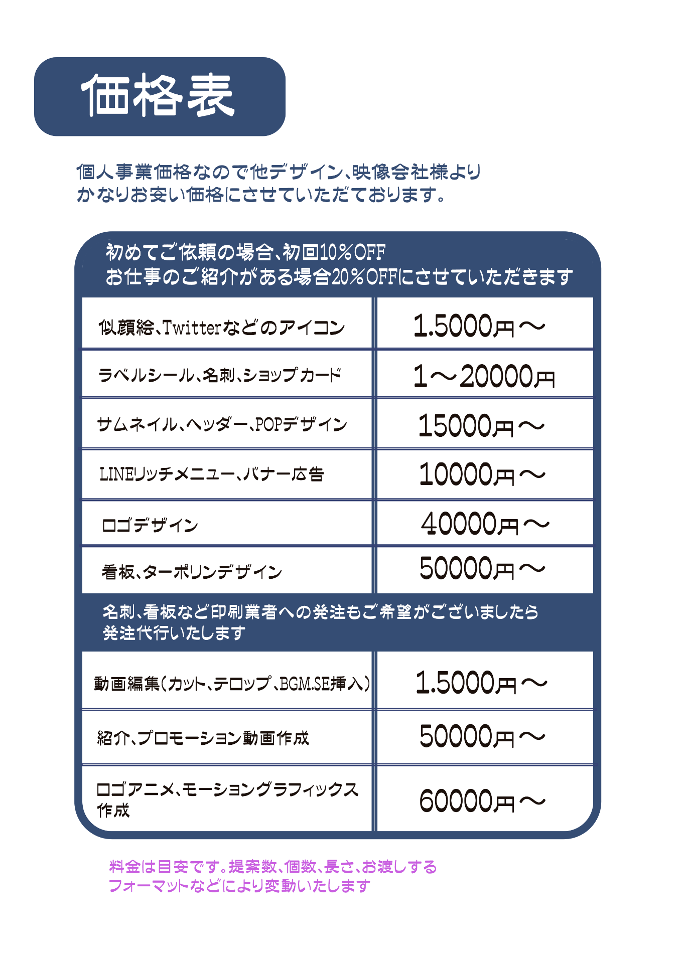 料金は目安です。提案数、個数、動画の長さ、お渡しするフォーマットなどにより